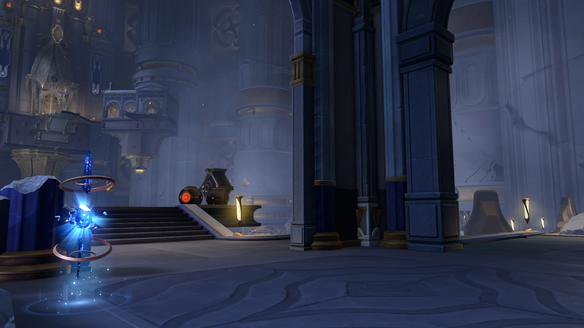 Một bệ treo bên trong pháo đài bầu trời, trong màn đêm đen kịt, cột trụ máy móc trông giống như những bộ xương khổng lồ càng trở nên u ám và đáng sợ hơn.