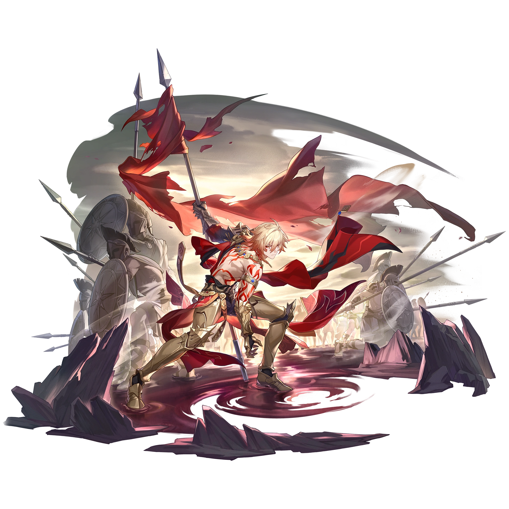 Mydeimos bất tử, sư tử rời bầy, Hậu Duệ Chrysos săn đuổi ngọn lửa Phân Tranh. Bạn phải chịu đựng hàng vạn cái chết, tắm máu trở về, một mình gánh vác số mệnh điên cuồng - giết vua và trở thành vua, giết thần và trở thành thần. Chân sắt chinh chiến giẫm đạp khắp vùng hoang dã, cuối cùng sẽ nhuốm máu của quê hương.[14]