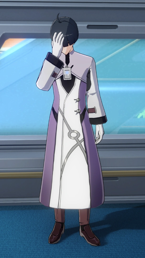 Abraham has dark gray hair in a long bowl haircut that covers his small brown eyes. He wears a desaturated lilac variant of the space station uniform, with brown pants and shoes underneath. He has his identity card attached at his chest.