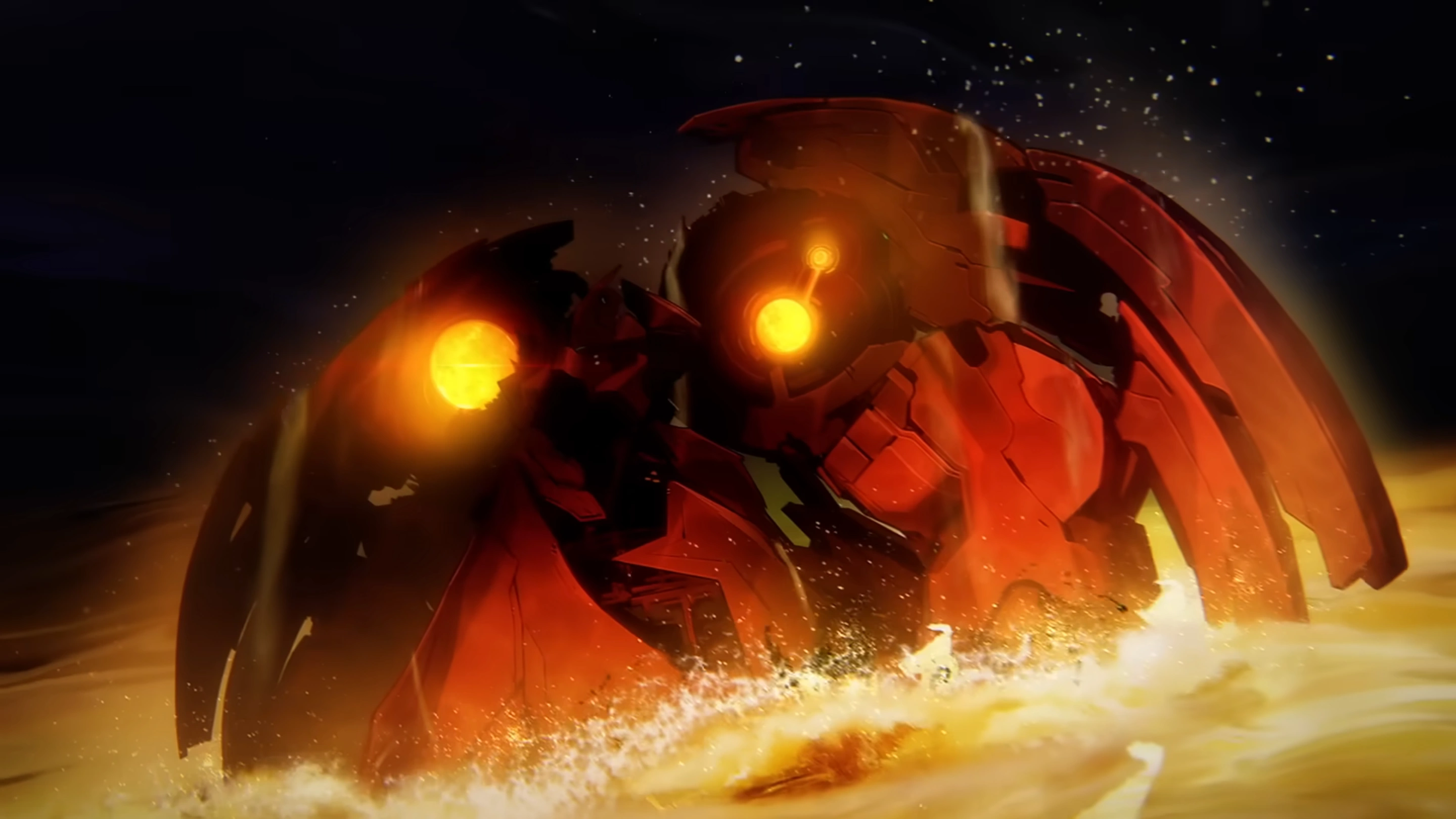 Archforger resembles a colossal crimson robot with a wide bulky torso and arms, large wing-like protrusions on their back, and multiple suns or sun-like energy embedded into their shoulders.