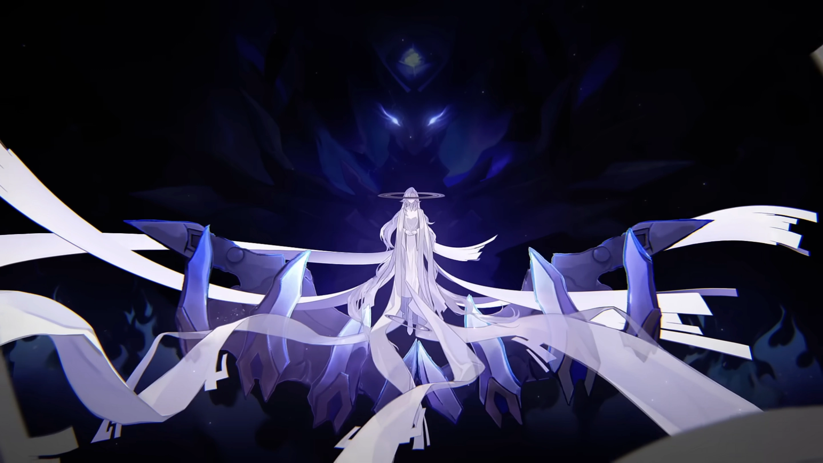 Celenova appears as a pale skinned humanoid woman with long white hair tied in several ponytails. She wears a white sleeveless bodysuit and collared short dress under priest-like robes and a mantle that she loosely drapes behind her by their sleeves. Her robes extend out into several lengthy ribbons with rectangular protrusions at the edges and she has a golden claw-like accessory on her right hand. Two halos resembling planetary rings also surround her with a larger halo covering her eyes and a smaller one hanging around her shins.