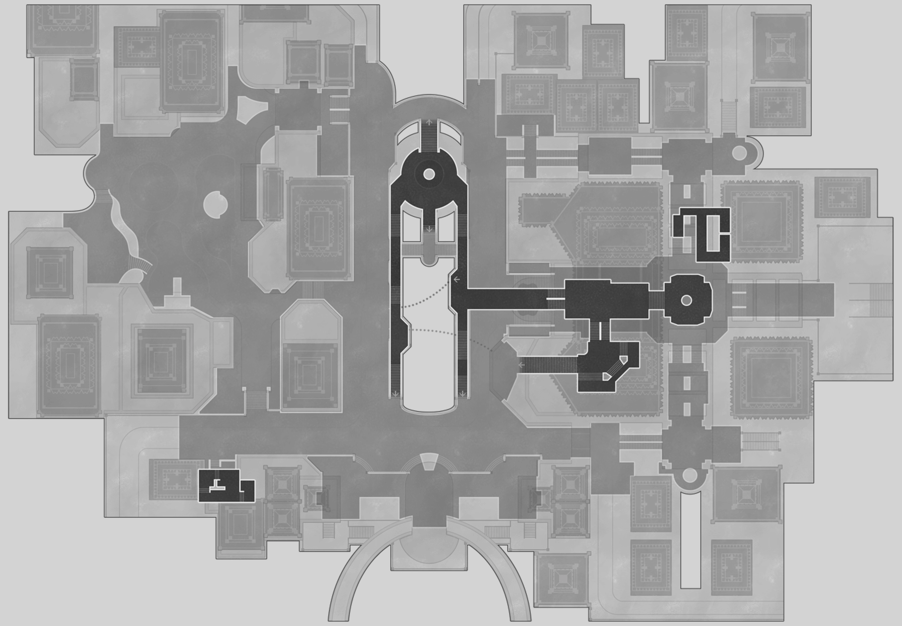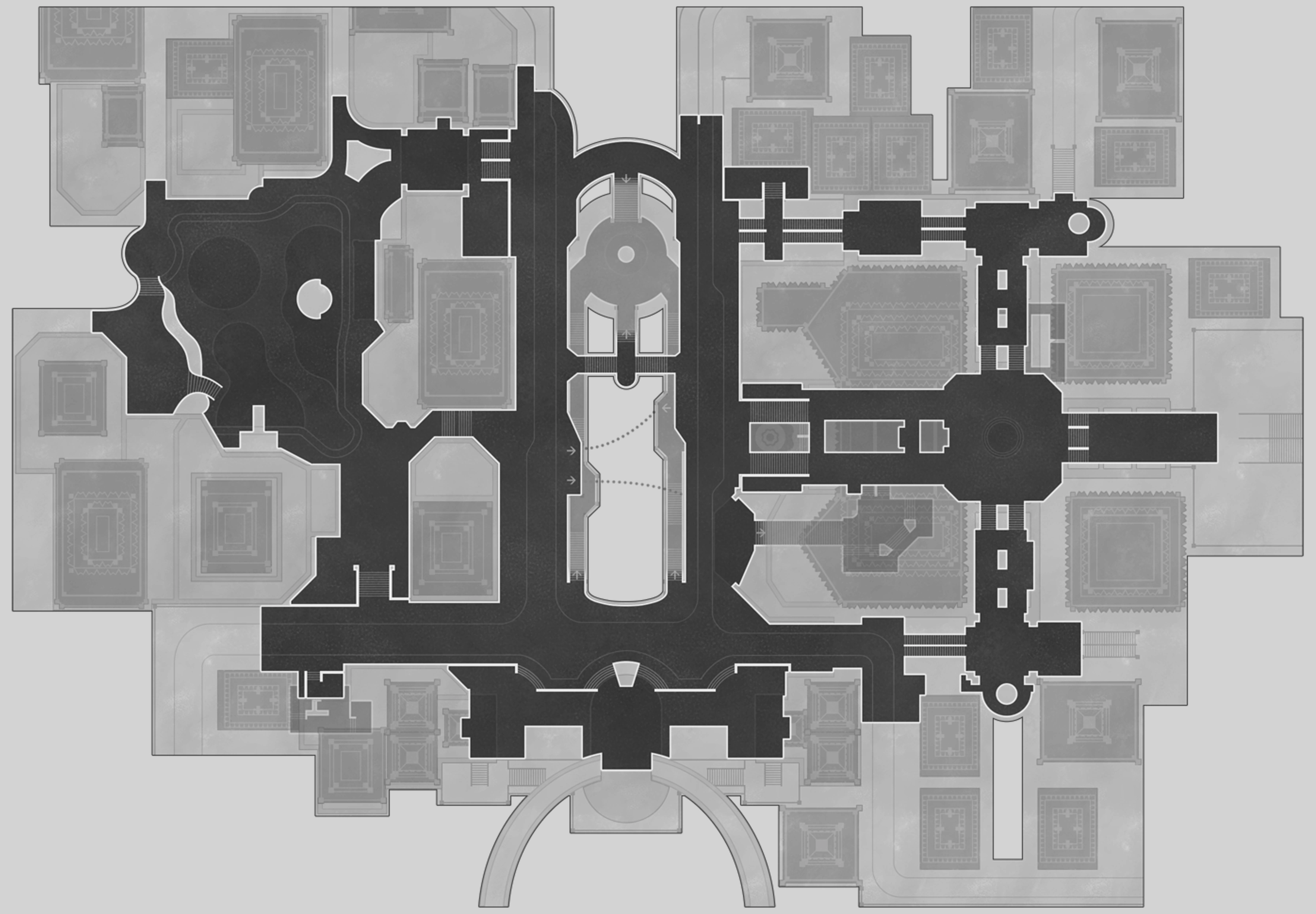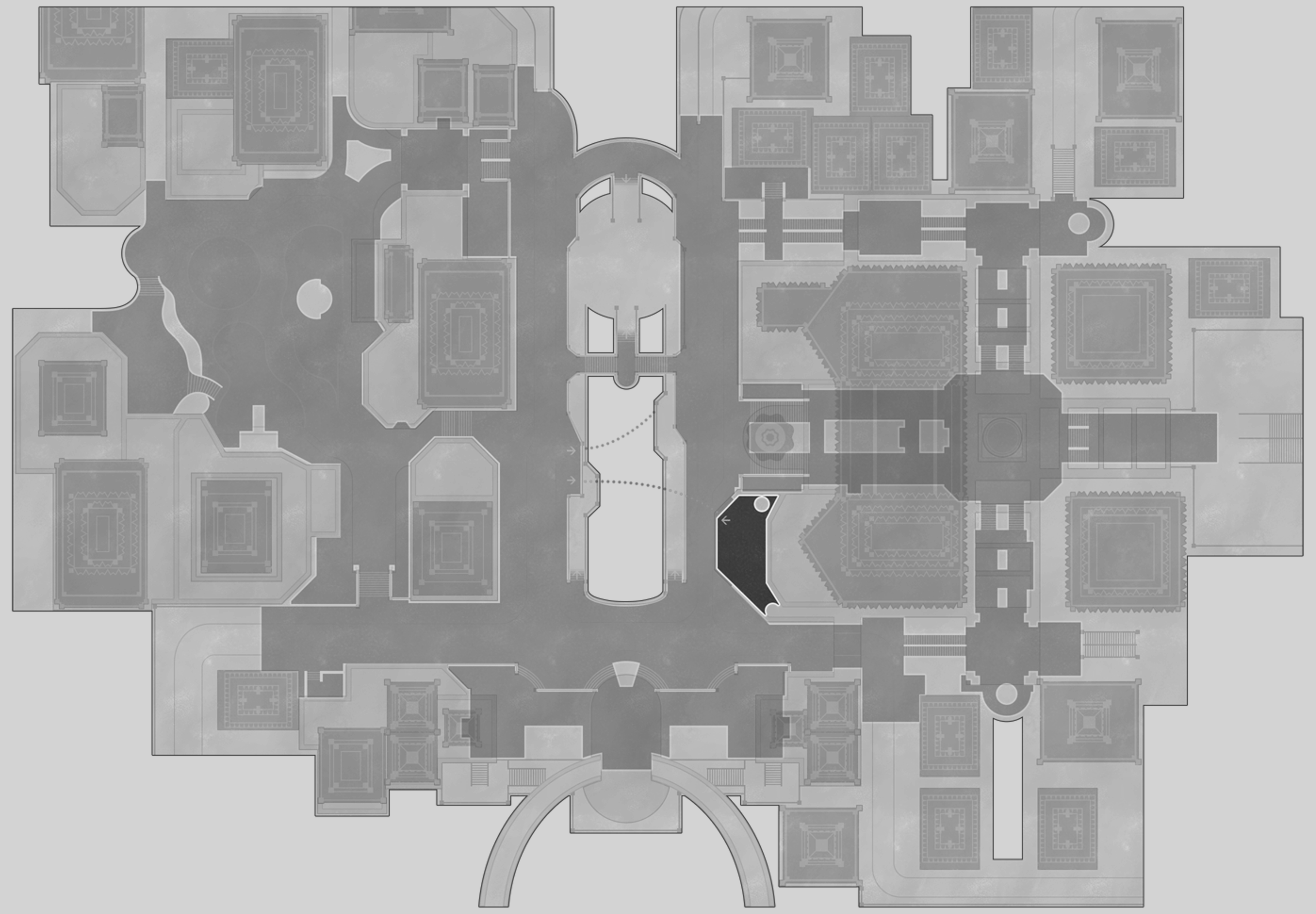 The plaza before the entrance to The Reverie. The magnificent dial stays halted and unmoving, while fountains erupt with golden syrup, reminding guests they dwell within the Dreamscape.