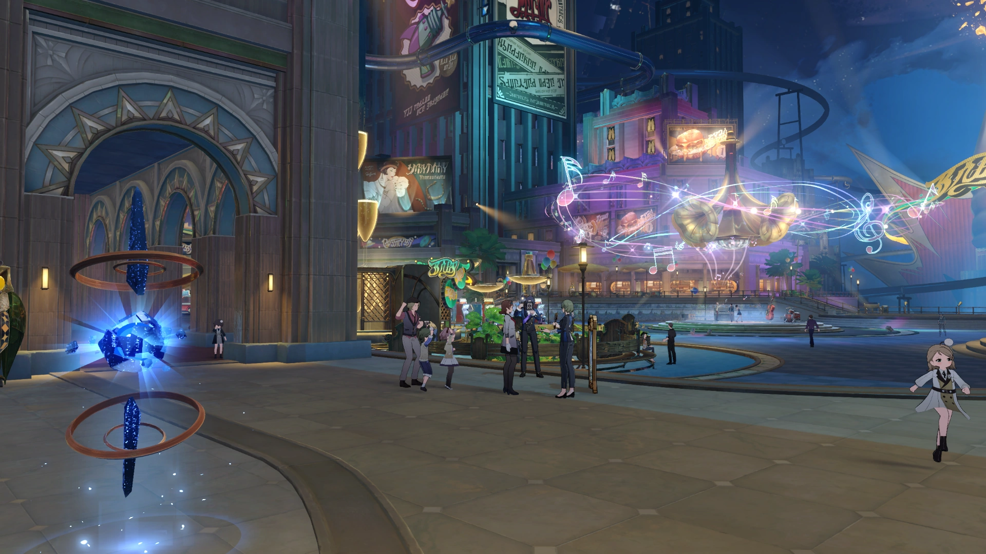 The most bustling Commercial District in the Golden Hour, established by Old Oti, head of the Alfalfa Family. Pedestrians flow through here like a never-ending stream, and splendid lights imbue this place with a radiance comparable to that of day.