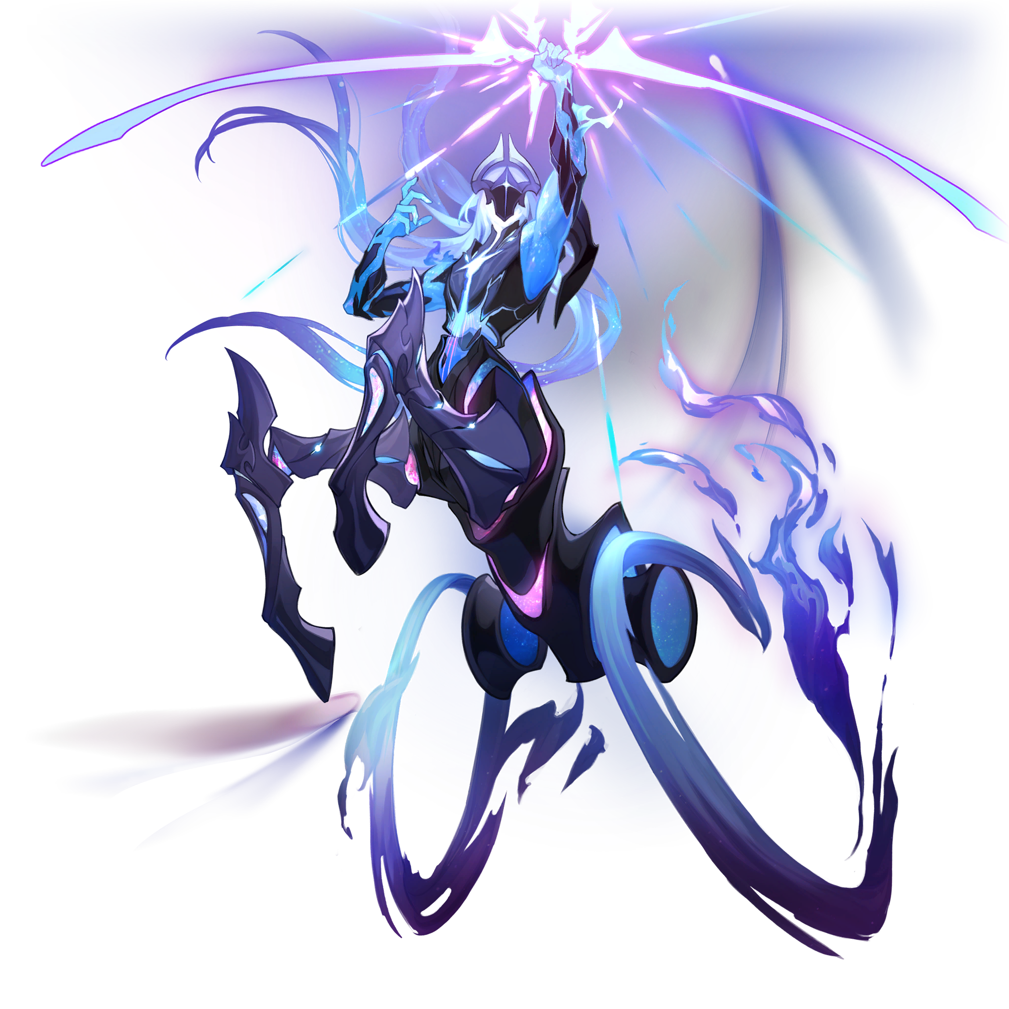 Lan is described as a tall, valiant prince with a crown in the Simulated Universe. THEY have light blue skin and long, flowing sky-blue hair with periwinkle accents that reaches past THEIR waist. Lan's face is obscured by a black mask with a white star in the middle, which extends to THEIR black headpiece. THEY possess centaur like features, taking form of a man combined with an equine below the waist, while the hind legs are replaced by blue fire-like wheels of a chariot.