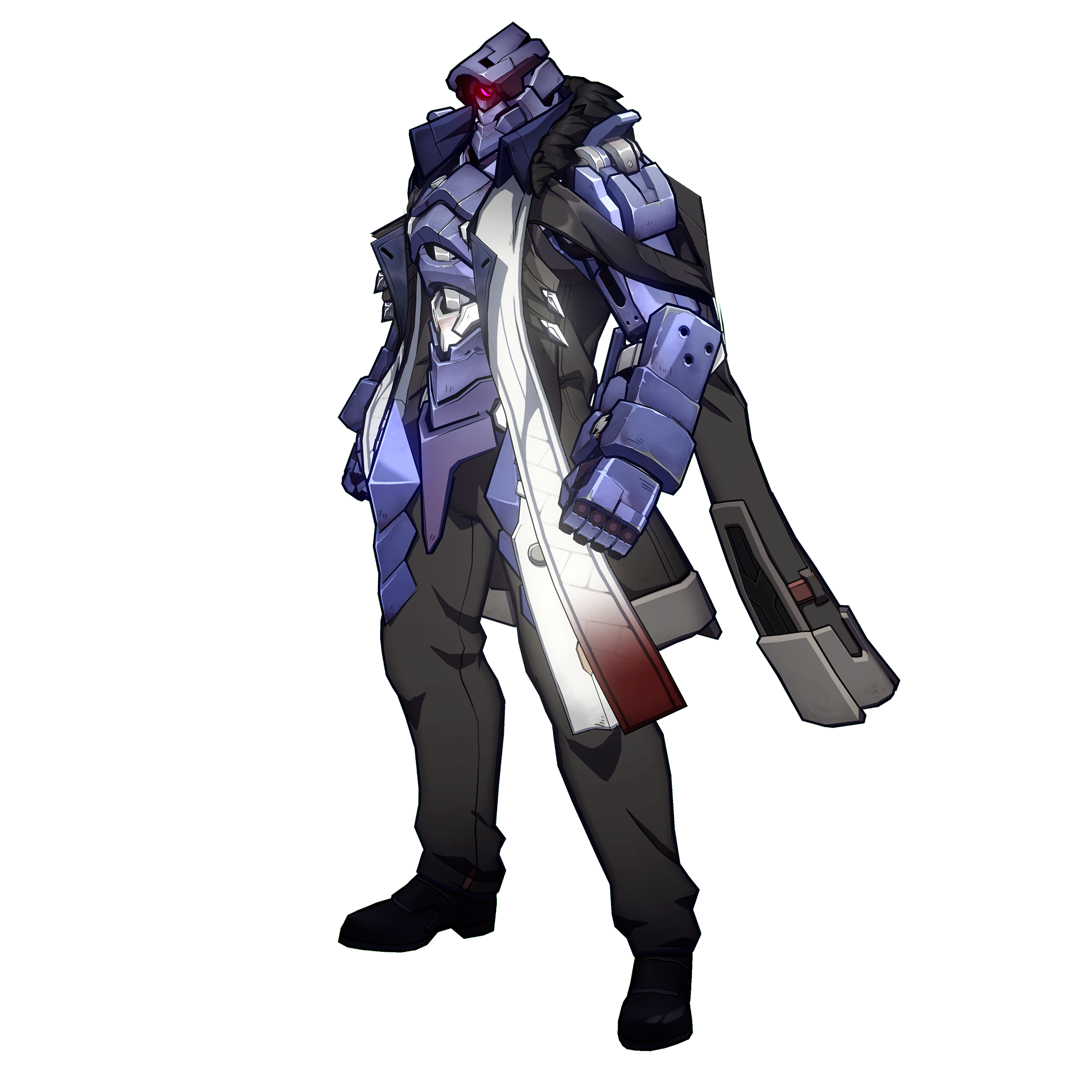 Svarog is a tall, dark blue mech with a glowing pink cyclopean eye. He wears black pants and shoes as well as a fur jacket with multiple openings that expose his shoulders.